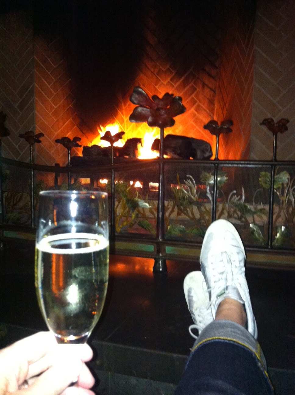 having a cocktail in the lobby of the fabulous hotel in front of the fire place